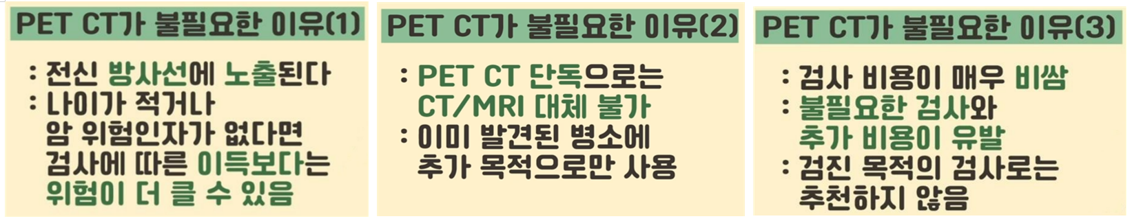 그리고 이 PET CT 자체가 매우 민감하게 병들을 찾아내는 검사이기 때문에 체내에 각종 작은 염증들, 생화학적 변화들까지도 다 이상으로 잡아냅니다. 일단 이 검사에서 이상이 나오면 따로 진료도 봐야 되고 또 해당 부위에 초음파, CT, MRI 등 여러 가지 불필요한 의학적 검사를 추가로 해야 되는 경우가 많이 생깁니다.